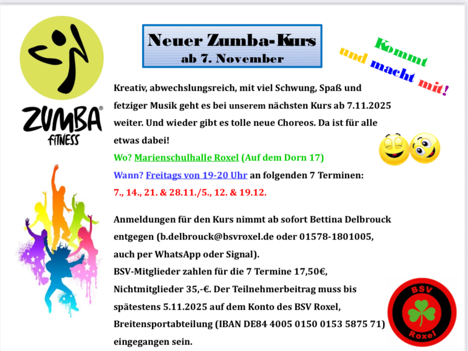 ZUMBA findet im BSV Roxel e.V. als Kurs mit jeweils 8 bis 12 Terminen statt, auch Mitglieder zahlen eine Kursgebühr